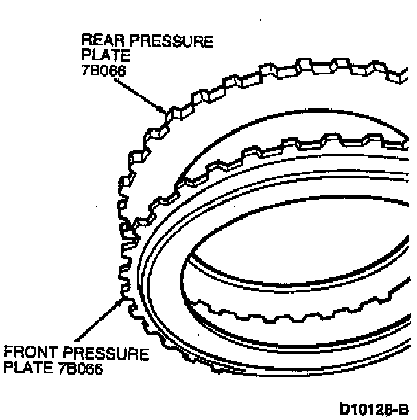 5. Install front clutch pressure plate, clutch pack and rear clutch pressure plate. Position the stepped side of front clutch pressure plate down with flat side toward clutch pack and rear clutch pressure plate flat side toward clutch pack.