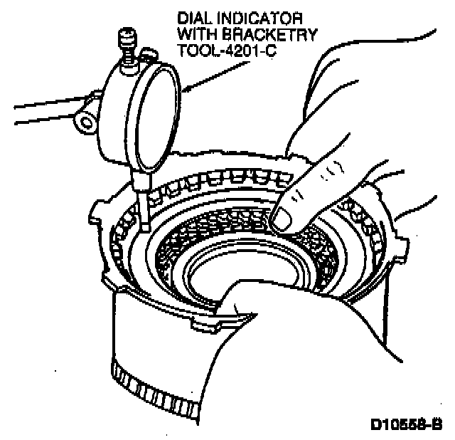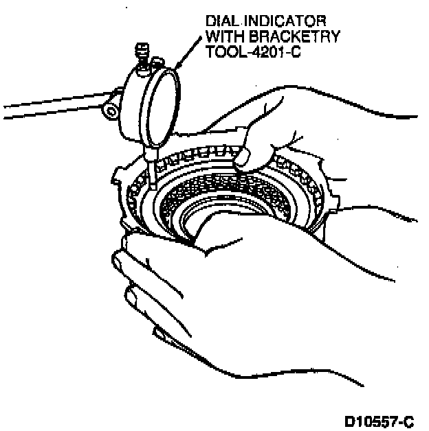 6. Install clutch pack clutch pressure plate retainer snap ring and check the clearance between the clutch pressure plate retainer snap ring and the clutch pressure plate using a feeler gauge. Clutch pressure plate should be held downward as clearance is checked using Dial Indicator with Bracketry TOOL-4201-C or equivalent. The clearance should be:
