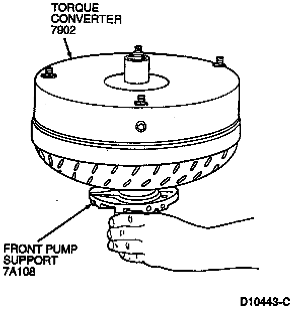 2. Mount torque converter on the front pump support with the splines on the one-way clutch inner race, engaging the mating splines of the front pump support.