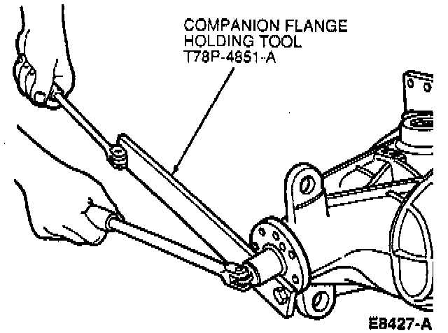 2. Hold rear axle universal joint flange with Companion Flange Holding Tool T78P-4851-A and loosen pinion nut.