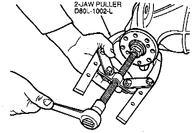 3. With pinion nut still engaged by a few threads install 2-Jaw Puller D80L-1002-L or equivalent and pull rear axle universal joint flange loose on splines.