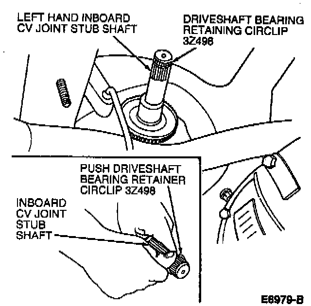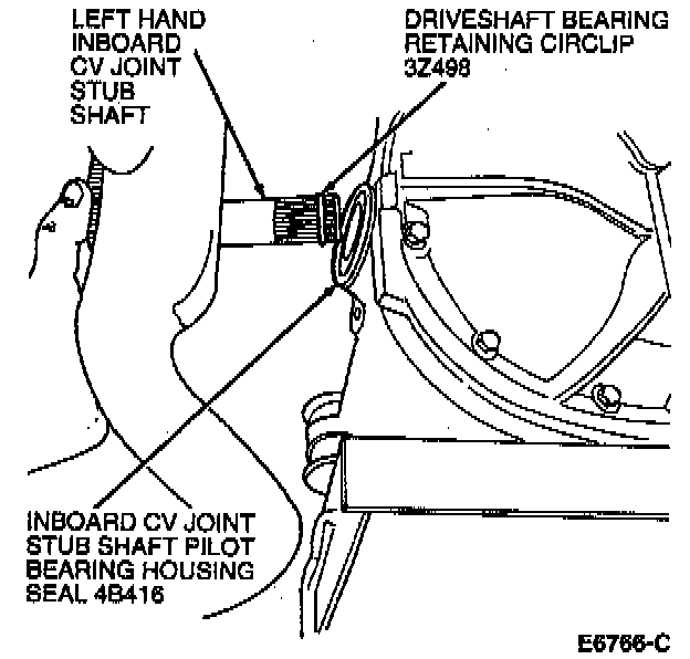 1. Replace inboard CV joint stub shaft pilot bearing housing seals.2. Install new driveshaft bearing retainer circlip on LH inboard CV joint stub shaft by pushing new driveshaft bearing retainer circlip into stub shaft groove.