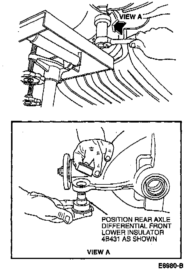 5. Install bushing, washers and nuts on rear axle differential front lower insulator. Tighten to 92-136 Nm (68-100 ft. lbs.).