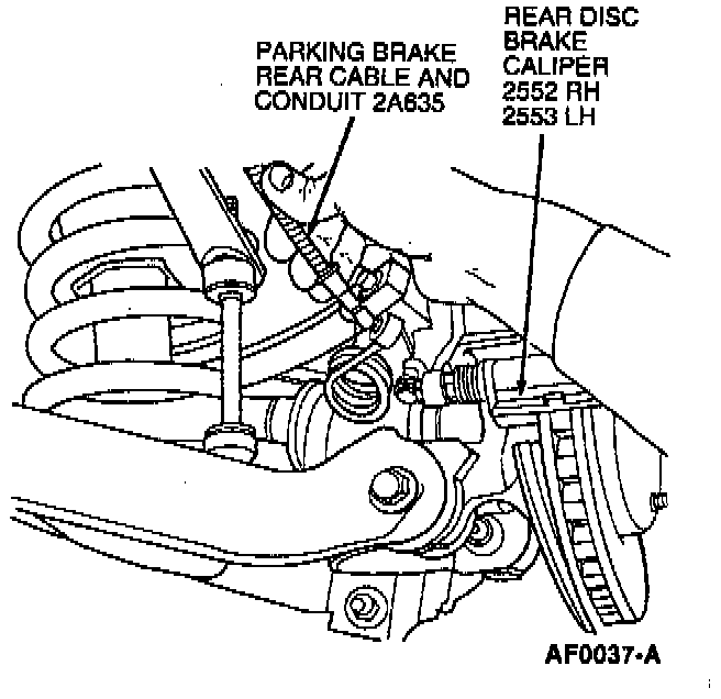 19. Install parking brake rear cable and conduit on the rear disc brake caliper.