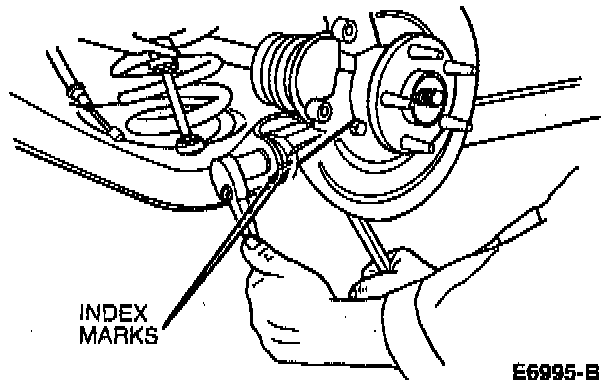 14. Align paint marks on rear suspension arm and bushing and knuckle bushing. Tighten bolts to 160-200 Nm (118-147 ft. lbs.).