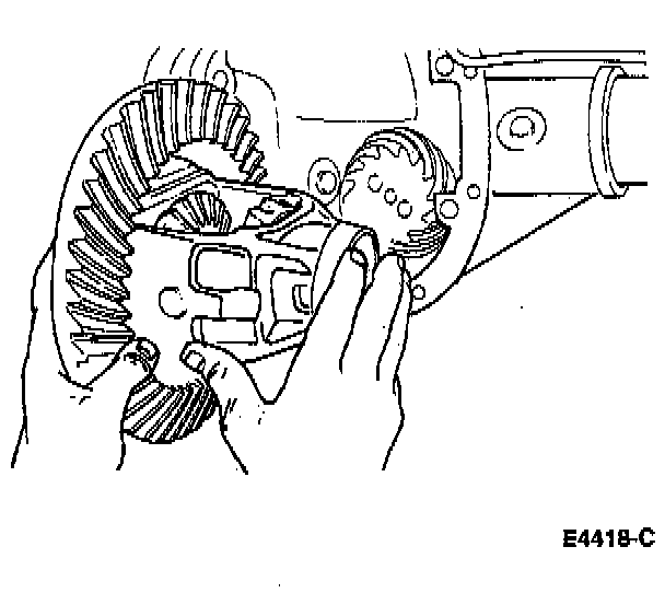 1. With pinion depth set and pinion installed, place the differential case/gear subassembly with differential bearings and differential bearing cups in rear axle housing.