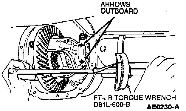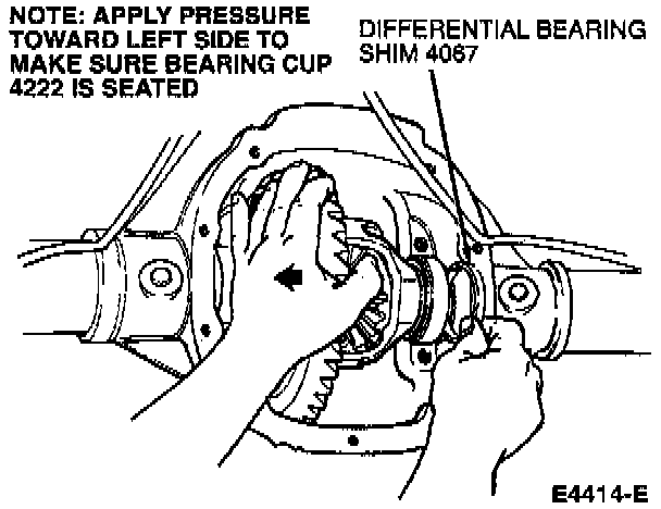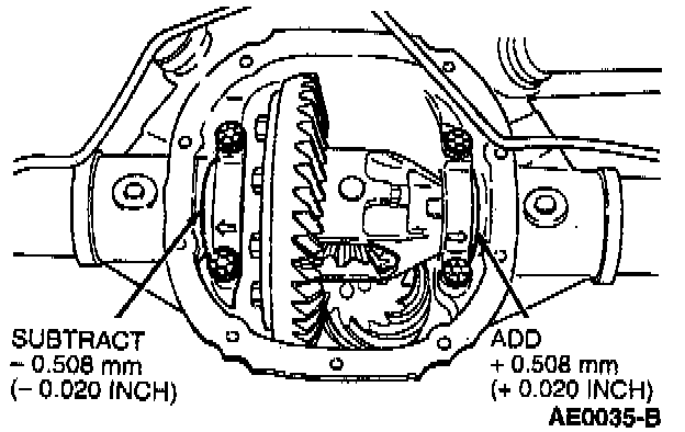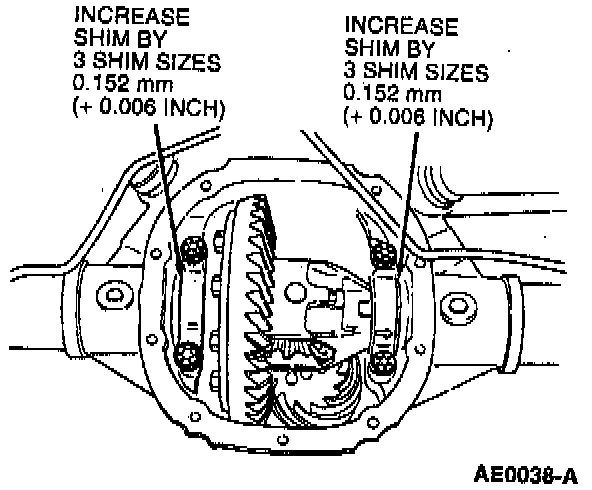 14. Increase both LH and RH differential bearing shim sizes by 0.10 mm (0.004 inch) and install for correct differential bearing preload. Make sure the shims are fully seated and the assembly turns freely.