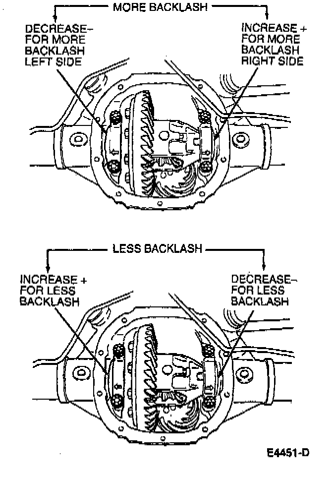 10. If backlash is not to specification, correct backlash by increasing thickness of one differential bearing shim and decreasing thickness on the other differential bearing shim by the same amount. Refer to the illustrations for approximate shim change.