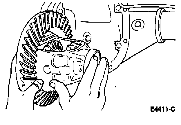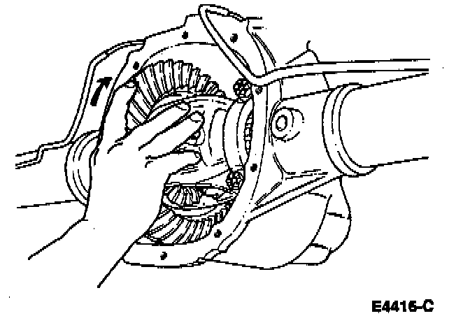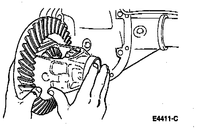 1. With the pinion removed, place differential case/ring gear subassembly with differential bearings and differential bearing cups in rear axle housing.