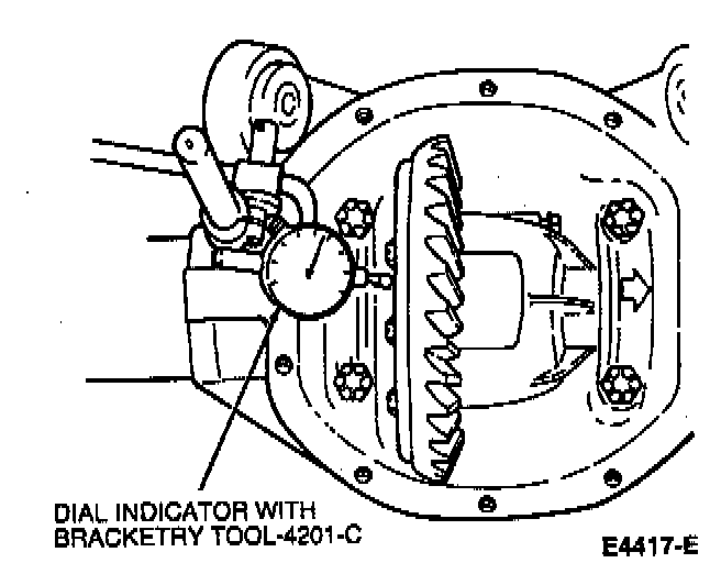 7. Install Dial Indicator with Bracketry TOOL-4201-C or equivalent. Check and note ring gear runout.