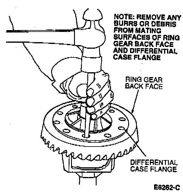 If the ring gear runout check (before disassembly) exceeds specification, the condition may be caused by a warped ring gear, a damaged rear axle housing loss of differential bearing preload or debris between the ring gear back face and the case flange. To determine the cause of excessive runout, proceed an follows: