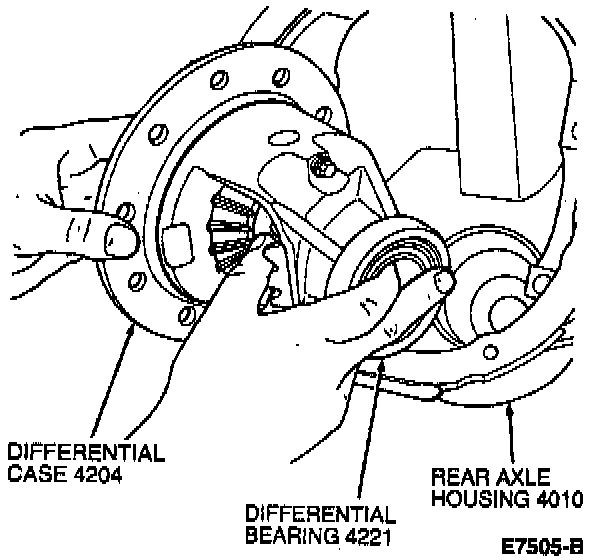 13. Press new differential bearings on differential case hubs using Differential Side Bearing Replacer T57L-4221-A2. Install differential assembly in carrier without differential ring gear and pinion.