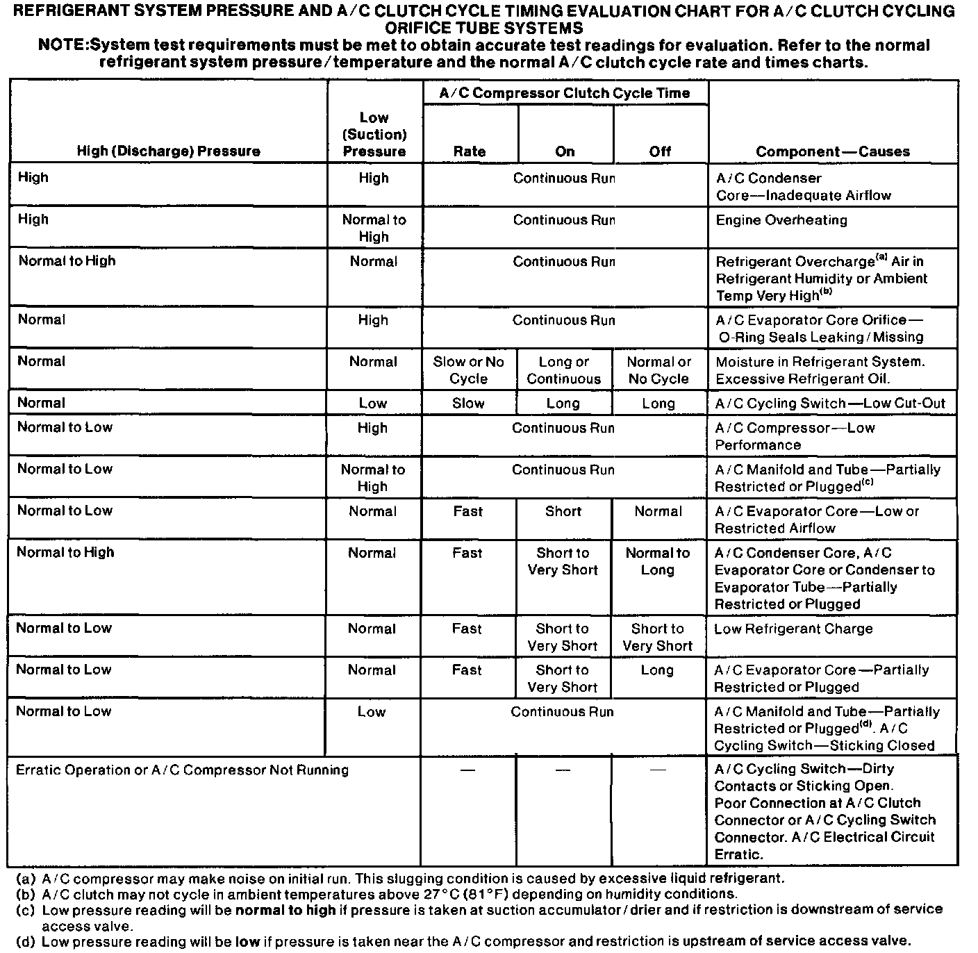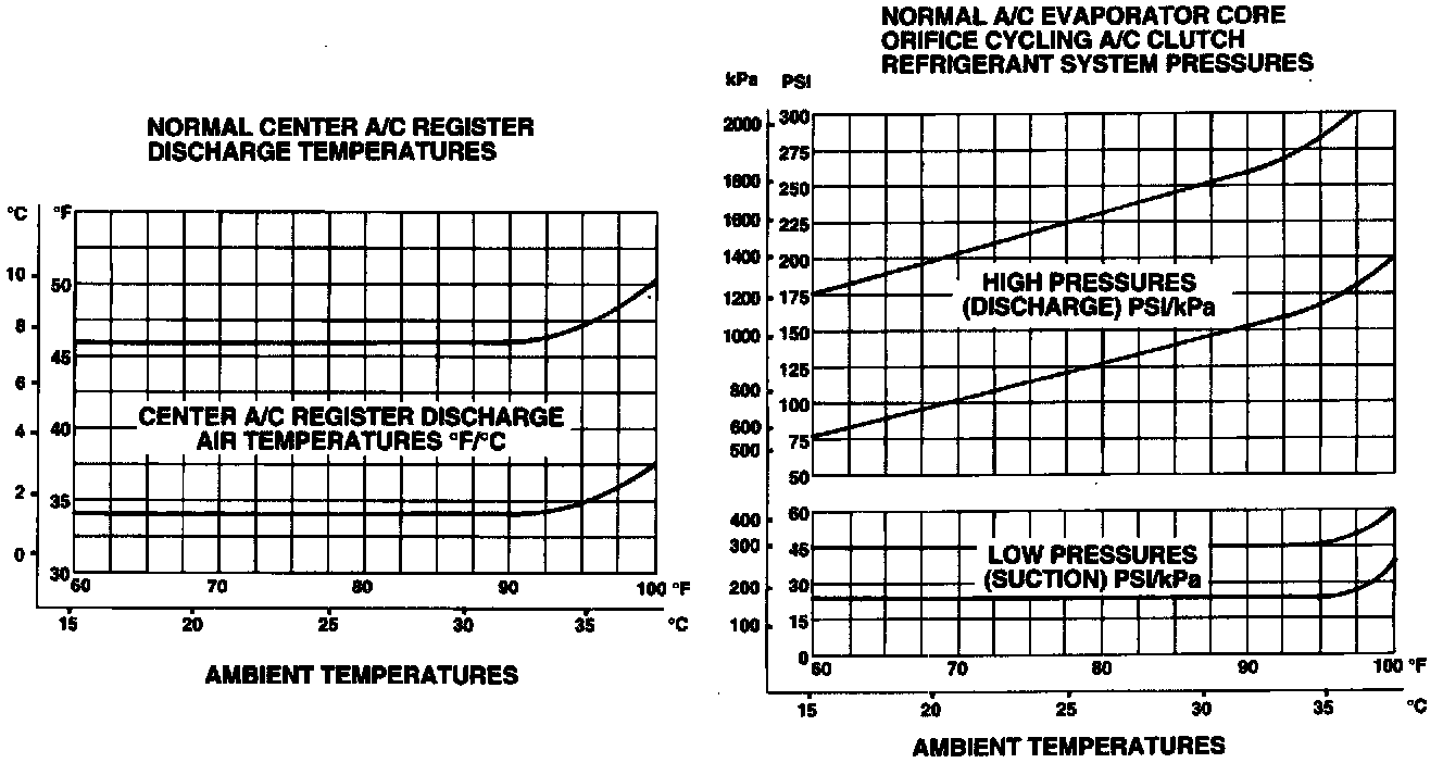 The best way to diagnose a condition in the refrigerant system is to note the system pressures (shown by the manifold gauges) and the A/C clutch cycle rate and times, then compare the findings to the following charts.