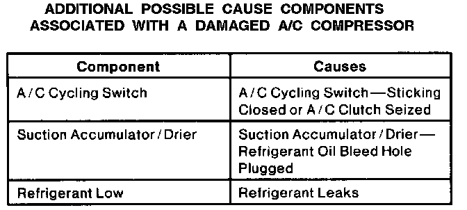At the bottom of the chart, additional possible cause components are listed for poor operation or a damaged A/C compressor condition.