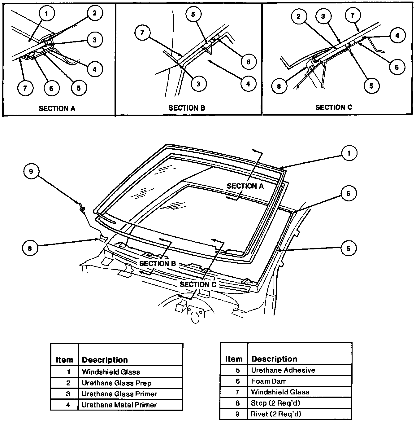 - Use only urethane for service of air and water leaks in urethane-set windshield.