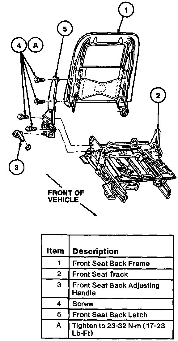 2. Tighten front seat back latch retaining screws to 23-32 Nm (17-23 Lb-Ft).