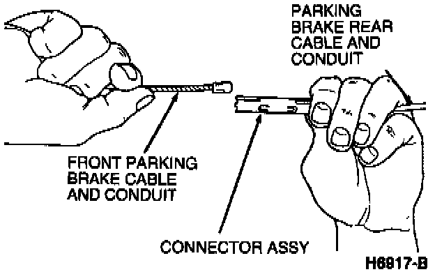 15. Connect front parking brake cable and conduit to parking brake rear cable and conduit.