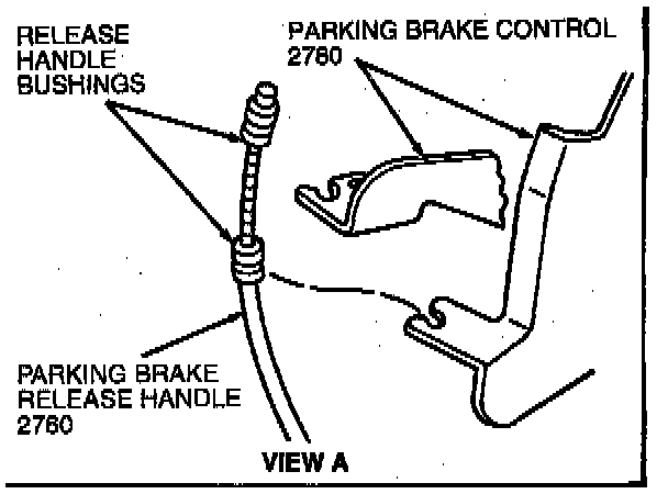 1. Attach parking brake release handle to parking brake control by snapping two parking brake handle bushings into parking brake control release lever.