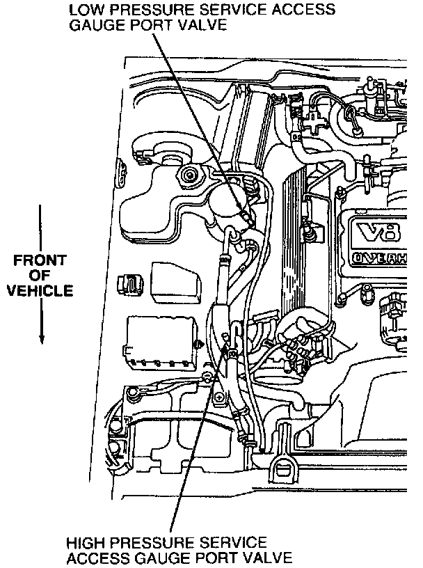 The low-pressure service access gauge port valve is located on the side of the suction accumulator/drier.