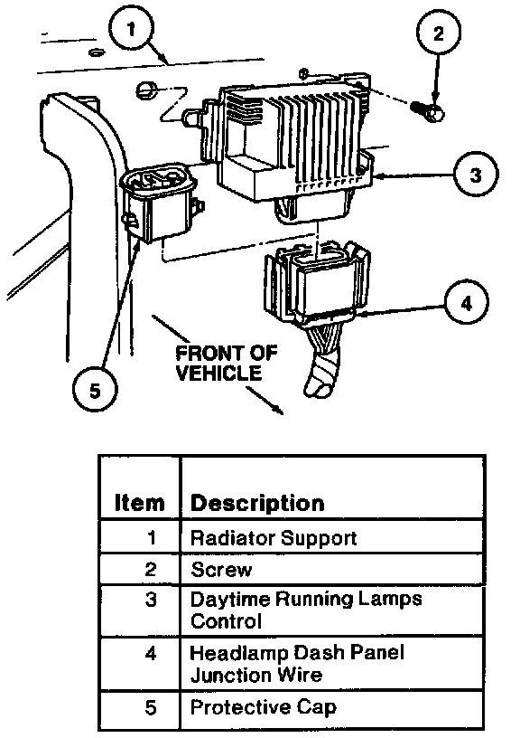 2. Remove screw retaining daytime running lamps control to radiator support.