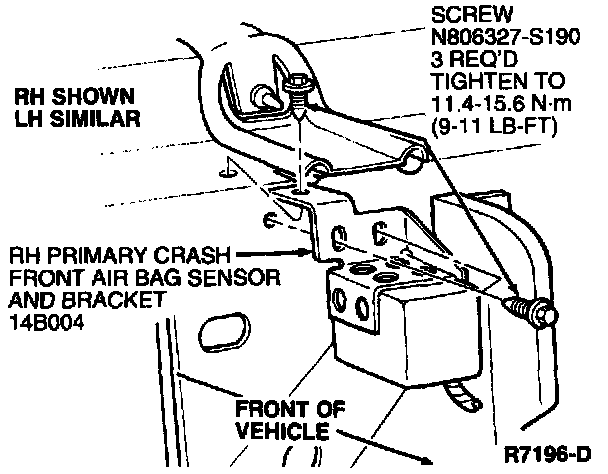 1. Position RH primary crash front air bag sensor and bracket or LH primary crash front air bag sensor and bracket in vehicle and secure RH primary crash front air bag sensor and bracket or LH primary crash front air bag sensor and bracket to RH or LH front of radiator support with primary crash sensor-to-radiator support screws. Tighten screws to 11.4-15.6 Nm (9-11 lb ft).