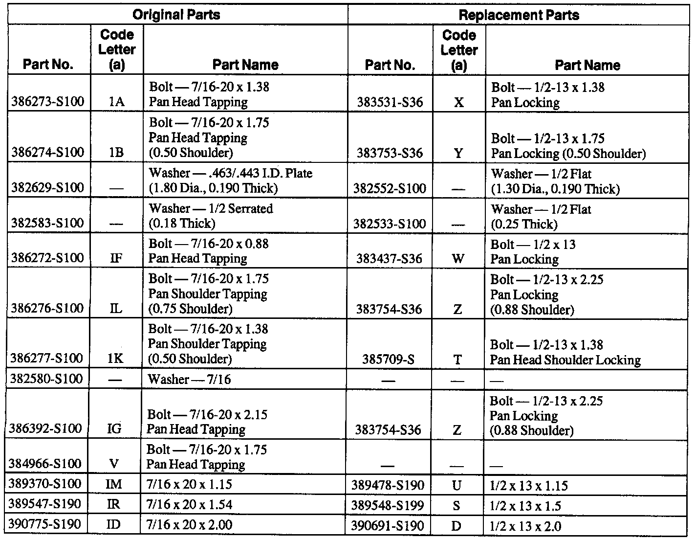 5. Install attachment parts in proper sequence. Tighten the replacement bolt to 34-46 Nm (25-33 lb ft). Original parts are to be replaced with service parts indicated in Parts Replacement Chart.