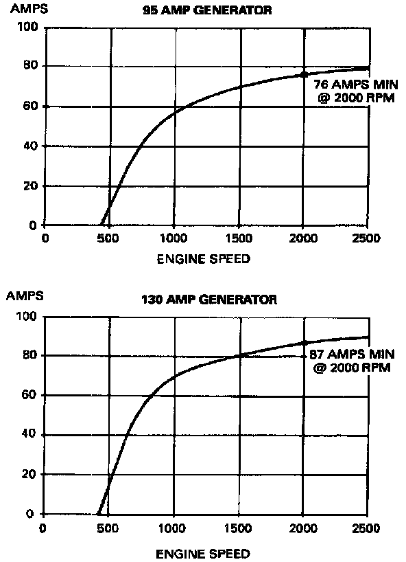4. With the engine running at 2000 rpm, adjust the Rotunda ARBST or equivalent load bank to determine the output of the generator. Generator output should be greater than the graph shown if not, refer to the Symptom Chart for diagnostic procedures. Symptom Related Diagnostic Procedures