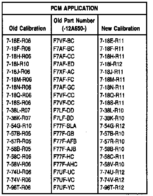 Perform normal diagnostics as outlined in the Powertrain Control/Emissions Diagnosis (PC/ED) Service Manual and reprogram the Powertrain Control Module (PCM). Refer to the following PCM Application Chart for correct PCM Calibration.