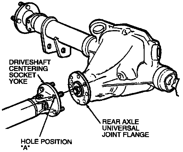2. Mark one hole position on driveshaft yoke at rear of driveshaft with the letter A and the eight rear axle U-joint flange holes (starting with the mating hole with driveshaft position A) from one through eight. Position A-1 is considered the original index position.