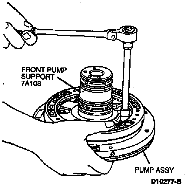 2. Remove five front pump support bolts. Separate front pump support and pump assembly.
