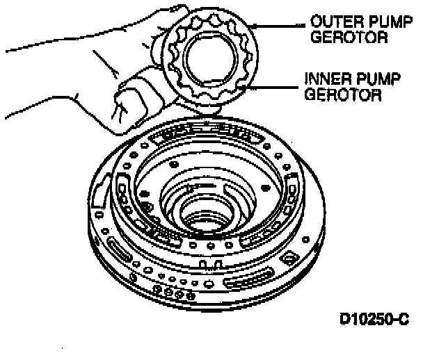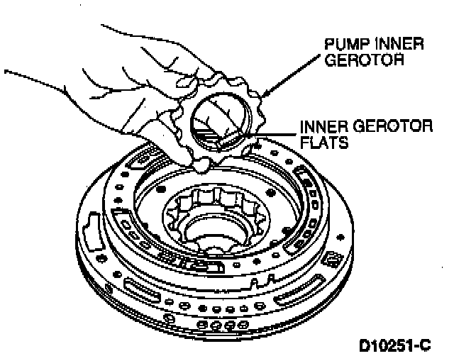 7. Install the inner and outer pump gerotors in pump body. The flats have steps that must face the pump body for ease of installing the torque converter.