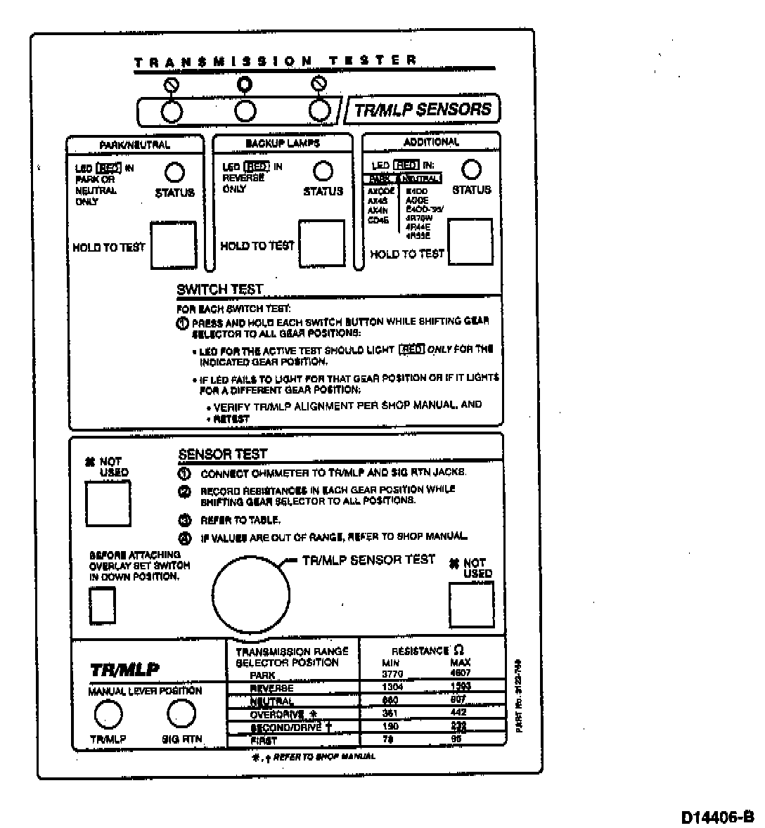 The transmission tester allows a technician to operate the electrical portion of the transmission range (TR) sensor. The TR/MLP tester usage is divided into five steps: