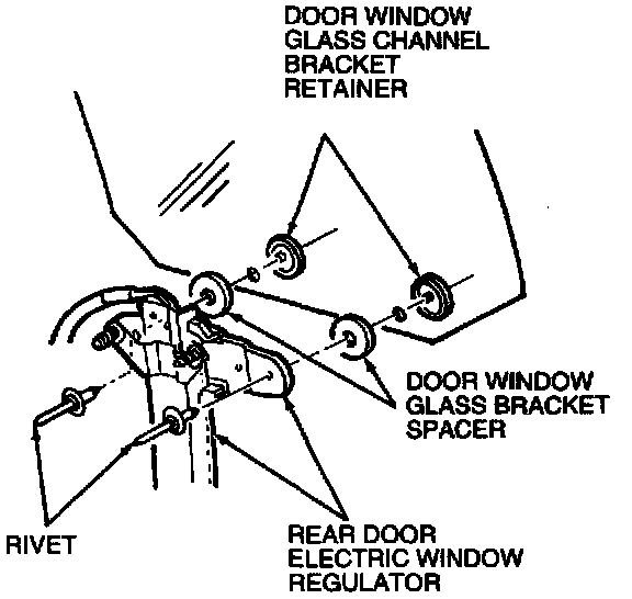 3. Lower rear door window glass to gain access to the two rear door window channel bracket retaining rivets and remove center pins from rivets using a drift punch. Using a 1/4-inch diameter drill, drill out the remainder of the rivets.