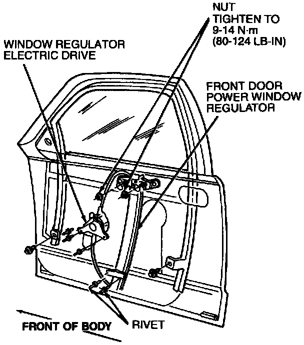 4. Install rivets retaining front door power window regulator to door inner panel (1/4-20 x 1/2 inch screw and 1/4-20 nut and washer assemblies or equivalent metric fasteners may be used).