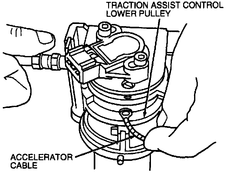 5. Rotate throttle control actuator lower pulley and disconnect accelerator cable from lower pulley.