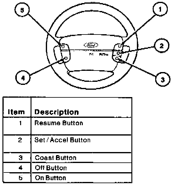 The speed control actuator switch buttons are mounted to the steering wheel. They consist of: