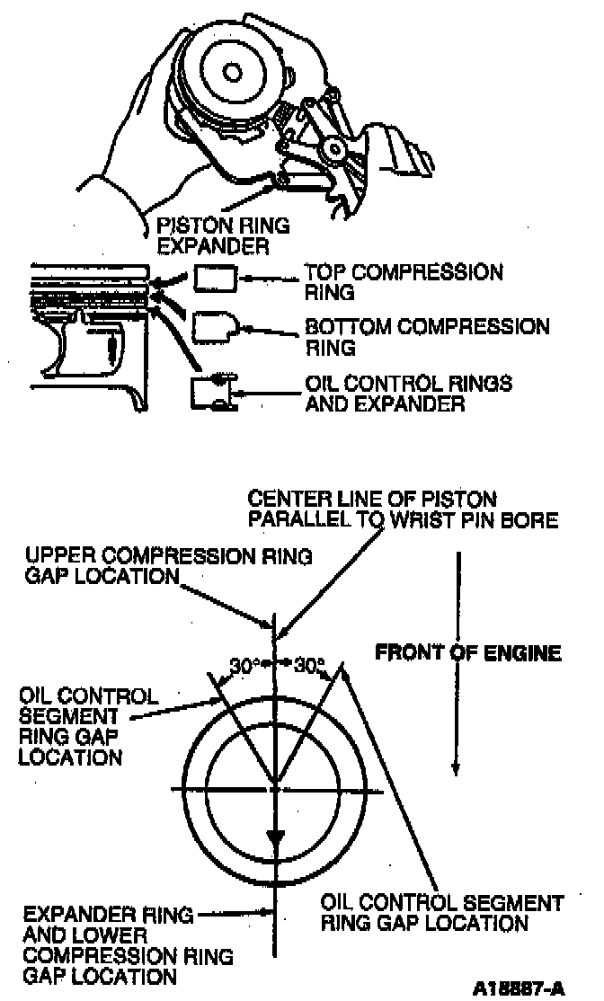 2. Using a suitable piston ring expander, install two compression rings as shown. Position compression rings, oil control rings and expander gaps on pistons as shown.