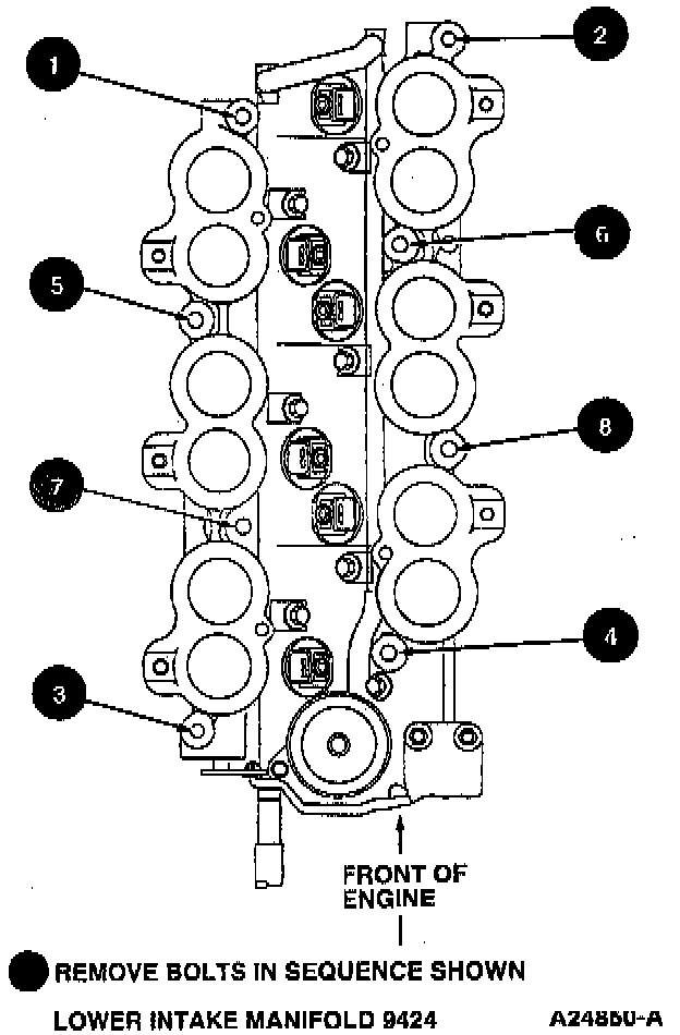 9. Remove lower intake manifold to cylinder head retaining bolts in sequence shown.