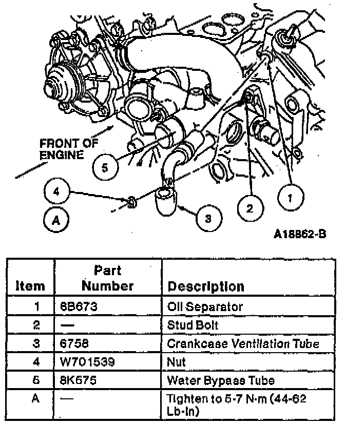 38. Remove crankcase ventilation tube retaining nut and crankcase ventilation tube from oil separator (6B673) and water bypass tube stud bolt.