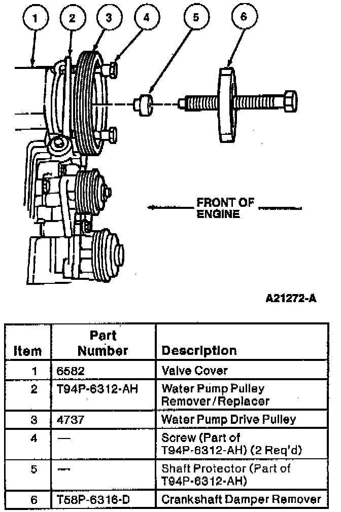 52. Remove crankshaft pulley (6312) from crankshaft using Crankshaft Damper Remover T58P-6316-D.