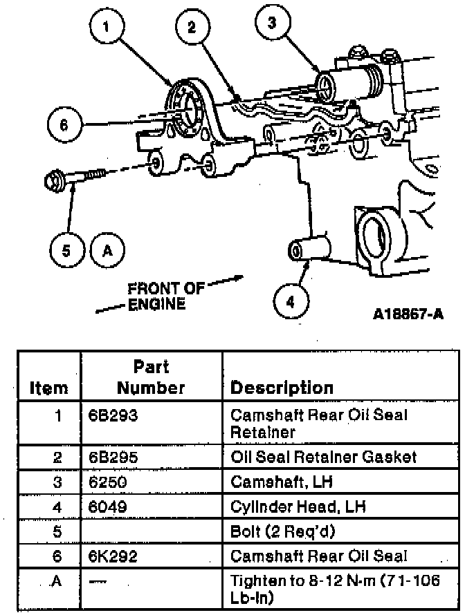 46. Remove camshaft rear oil seal retainer bolts and camshaft rear oil seal retainer and gasket from LH cylinder head.