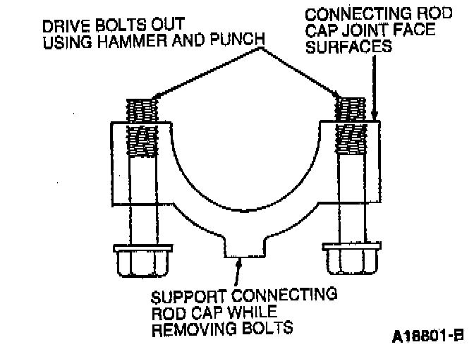 104. Connecting rod bolts are retained in the bolt hole with a light press fit. The bolts have been torqued to yield at least twice and must be discarded. Using a hammer and punch, drive bolts from bolt holes.