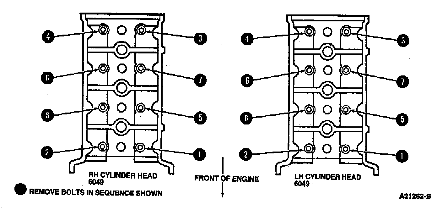 45. Loosen RH and LH valve cover retainer bolts and studs in sequence as shown in the illustration. Remove RH and LH valve covers from cylinder head.