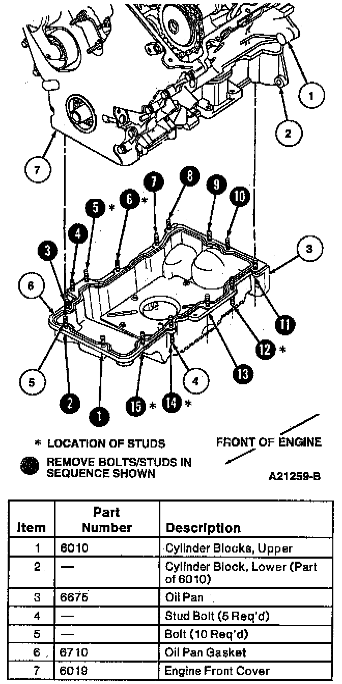57. Remove oil pan retaining bolts and stud bolts as shown in the illustration.