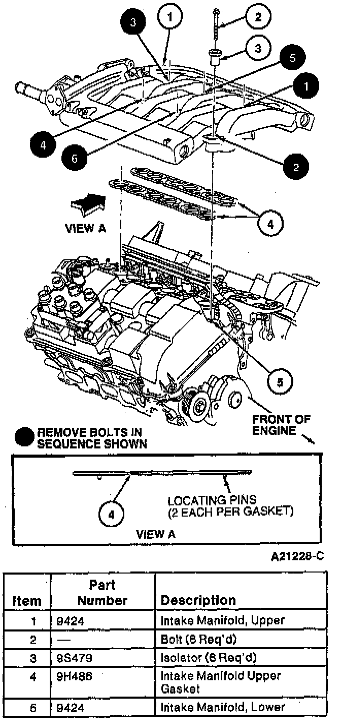30. Remove upper intake manifold retaining bolts in sequence as shown. Remove upper intake manifolds and intake manifold upper gaskets (9H486) from lower intake manifold.