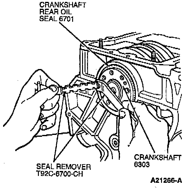 108. Using Seal Remover T92C-6700-CH and a piece of thin copper shim stock 0.25 mm (0.010 inch) thick between the crankshaft and Seal Remover T92C-6700-CH, remove crankshaft rear oil seal (6701) from cylinder block.