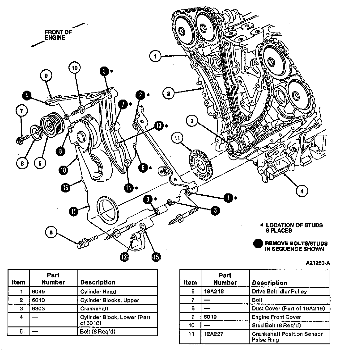 62. Remove engine front cover retaining bolts and studs in sequence as shown.