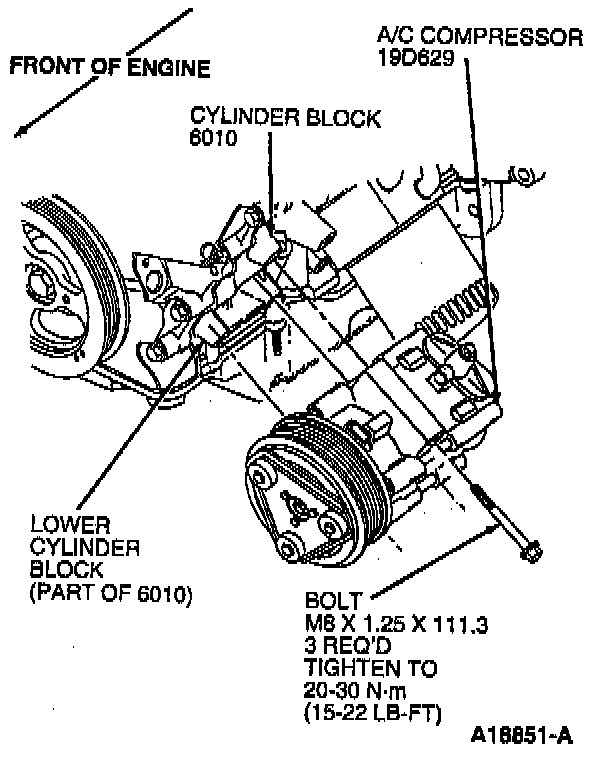 7. Remove A/C compressor mounting bolts from cylinder block (6010). Remove A/C compressor (19703).