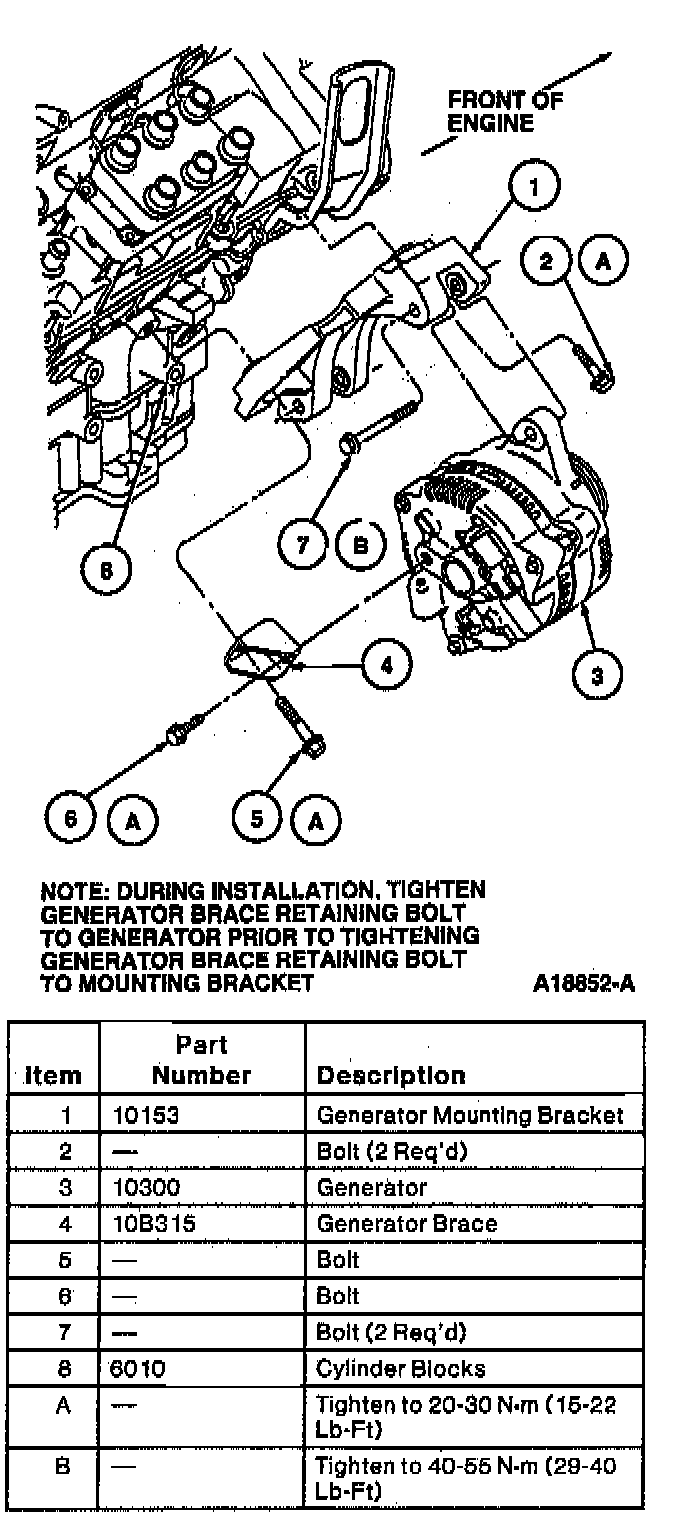 8. Remove generator brace (10B315) from generator (GEN) (10300) and generator mounting bracket.