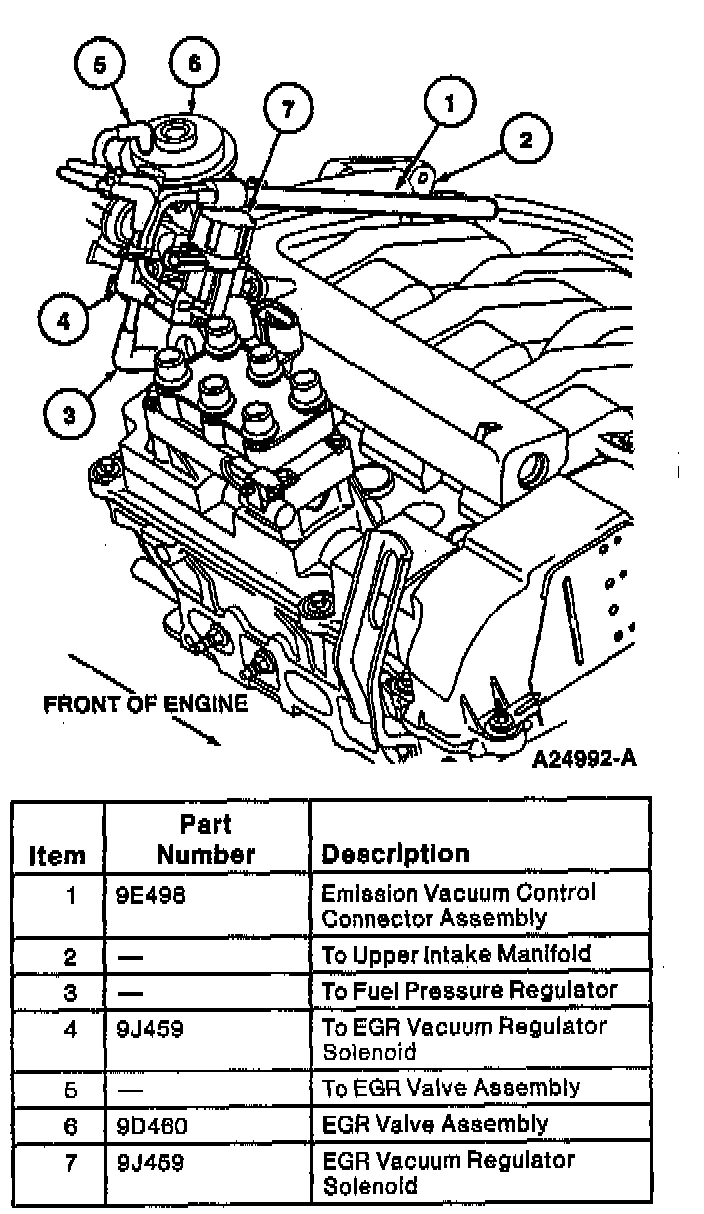 16. Depress black collet with a small screwdriver on upper intake manifold and disconnect emission vacuum control connector assembly from upper intake manifold. Disconnect EGR vacuum regulator solenoid (9J459) from EGR vacuum regulator solenoid, EGR Valve (EGR valve)(9D475), and fuel pressure regulator vacuum connector. Remove emission vacuum control connector assembly from engine.